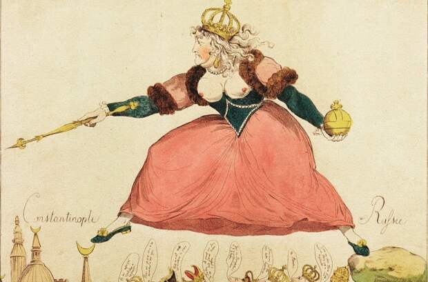 Карикатура на Екатерину II, вступившую в войну с Оттоманской империей. Под платье ее заглядывают лидеры европейских государств